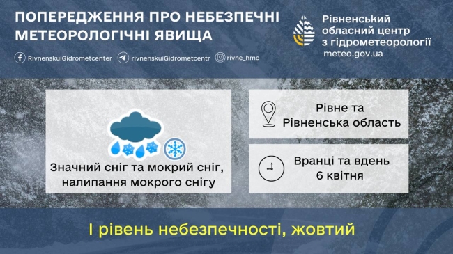 – Вночі невеликі опади, переважно мокрий сніг. Вранці та вдень значний мокрий сніг та ссніг.Вранці та вдень налипання мокрого снігу. На дорогах ожеледиця. Вітер північний, 9-14 м/с, пориви 15-20 м/с! – попереджають в обласному центрі з гідрометеорології.