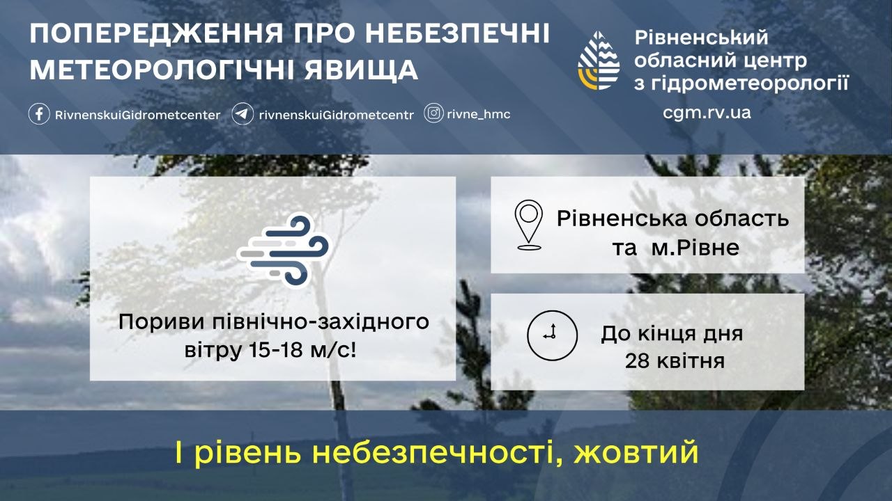 – У найближчу годину із збереженням до кінця дня 28 квітня, по місту Рівне та області очікуються пориви північно-західного вітру 15-18 м/с! Перший рівень небезпечності – жовтий.