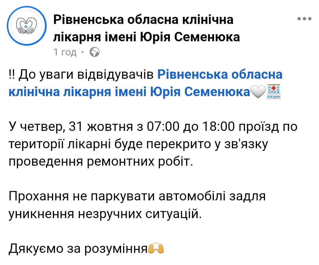 Новини Завтра не паркуйте авто на території лікарні у Рівному На те є вагома причина. admin 30 Жовтня, 16:30 0 хв. читання Поділитися З таким проханням до відвідувачів звертаються в обласній лікарні. Картопля у Рівному: не тільки українська, а й польська, з Єгипту… На фронті загинув кваліфікований будівельник з Кореччини Рівненський адвокат переконує, що розшук чоловіків за запитом ТЦК є незаконним Фабрика біля Рівного робить продукцію для «IKEA» У Рівному народився ще один малюк-«богатир» Поділитися цією статтею Facebook Telegram Копіювати посилання Приєднуйтесь 58тисСтежити1.2тисСтежити13.9тисСтежити6.1тисПідписатися Читайте нас у Telegram: тільки важливі та перевірені новини Новини 7 Грудня 2025 Картопля у Рівному: не тільки українська, а й польська, з Єгипту… 20:10 На фронті загинув кваліфікований будівельник з Кореччини 18:30 Рівненський адвокат переконує, що розшук чоловіків за запитом ТЦК є незаконним 18:00 Фабрика біля Рівного робить продукцію для «IKEA» 17:20 У Рівному народився ще один малюк-«богатир» 16:51 Влада пояснила, чому на Рівненщині немає «світла» більше 10 годин 15:50 Кілька років невідомий нападає на патріотичний мурал у Рівному 15:20 Загинув сантехнік з Вараша, про якого два роки не було нічого відомо 14:40 📷Рівняни масово одягають хустки 13:50 Зима допоможе російській армії наступати – розвідка Естонії 12:57 Всі новини