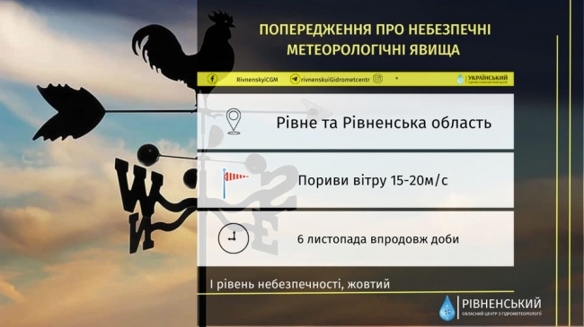 Рівненські метеорологи попереджають: сьогодні упродовж доби в місті та по області очікуються пориви західного вітру 15-20м/с. Це І рівень небезпечності, жовтий.