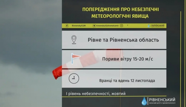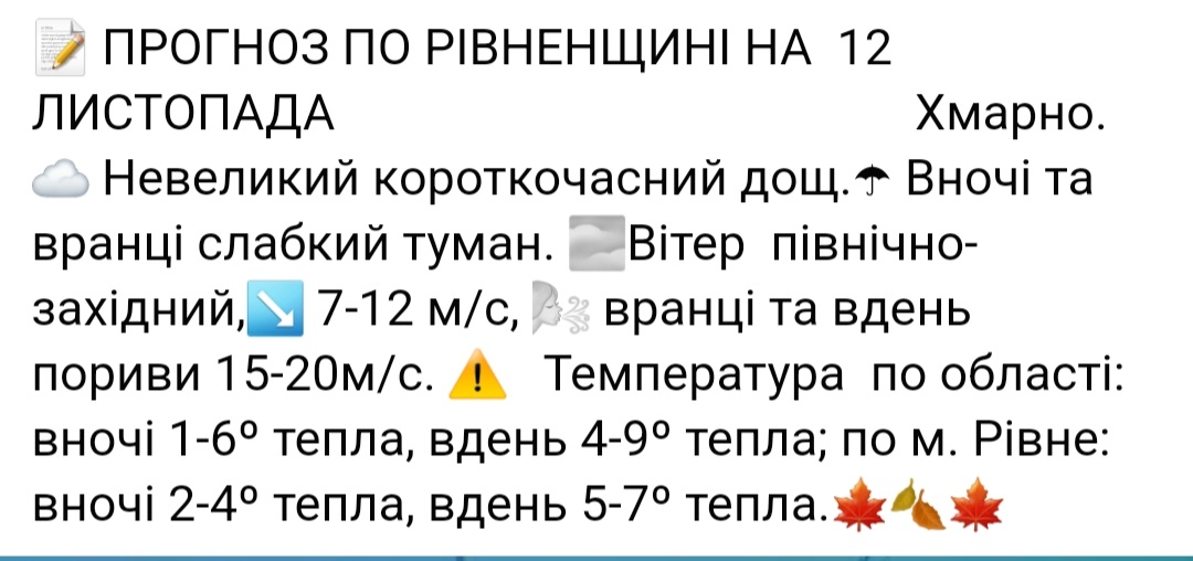 Новини Завтра у Рівному чекають шквального вітру Вранці та вдень 12 листопада по місту та області можливі пориви північно-західного вітру швидкістю 15-20 м на секунду, - попереджають метеорологи. Це перший, жовтий рівень небезпечності. admin 11 Листопада 2023, 14:19 0 хв. читання Поділитися Також фахівці обласного центру з гідрометеорології підготували прогноз погоди на завтра. Масова автотроща поблизу Рівного У Острозі зустріли з полону Олександра Тимощука Згорніть їх разом, як рулет Біля автовокзалу в Рівному відкрили ТЦ «Колорит» з дизайнерським «Сільпо» Чи зростуть ціни на пальне після удару по мосту на Одещині? Поділитися цією статтею Facebook Telegram Копіювати посилання Приєднуйтесь 58тисСтежити1.2тисСтежити13.9тисСтежити6.1тисПідписатися Читайте нас у Telegram: тільки важливі та перевірені новини Новини 20 Грудня 2025 Масова автотроща поблизу Рівного 13:43 У Острозі зустріли з полону Олександра Тимощука 12:43 Згорніть їх разом, як рулет 11:58 Біля автовокзалу в Рівному відкрили ТЦ «Колорит» з дизайнерським «Сільпо» 11:47 Чи зростуть ціни на пальне після удару по мосту на Одещині? 11:43 Енергетиці Рівненщині ще треба багато часу, щоб відновитися після атак Росії 11:00 Рівнян просять приєднатися до супроводу полеглих Захисників України 10:53 У Рівному вручать Меморіальні хрести родинам загиблих воїнів 5-ї штурмової бригади 10:30 30 тисяч гривень заплатили жителі Рівненщини за неіснуючі ялинки 10:04 «Живим коридором» на Рівненщині зустріли загиблого Героя Назара Панькевича 09:30 Всі новини