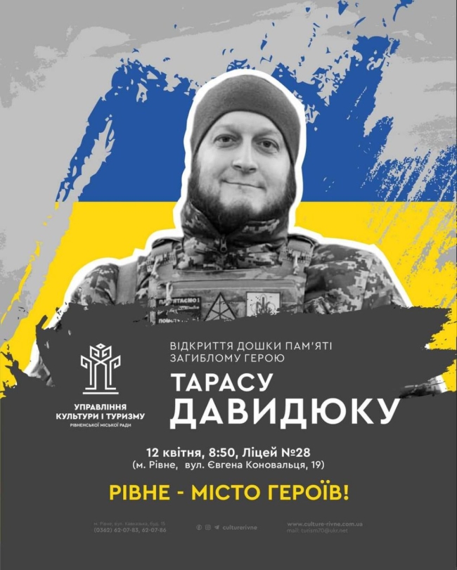 12 квітня о 08:50 на фасаді ліцею №28 відбудеться відкриття дошки пам’яті загиблому Герою Тарасу Давидюку, – повідомляє в.о. міського голови Рівного Віктор Шакирзян.