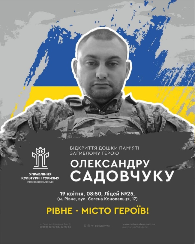 – 19 квітня о 08:50 на фасаді ліцею №25 відбудеться відкриття дошки пам’яті загиблому Герою Олександру Садовчуку, – повідомив в.о. міського голови Рівного Віктор Шакирзян.