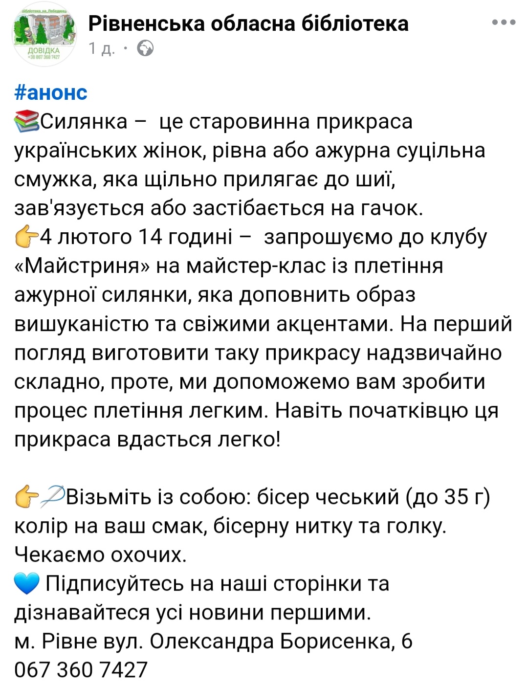 Усіх, хто любить творити щось власноруч і цікавиться українською культурою, обласна наукова бібліотека запрошує до себе – на майстер-клас з плетіння “силянки”.