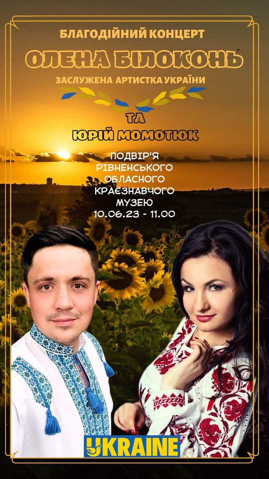 – Шановні рівняни та гості міста! 10 червня 2023 року (субота) об 11:00 на подвір’ї Рівненського обласного краєзнавчого музею відбудеться благодійний концерт Заслуженої артистки України (м. Полтава) волонтерки, благодійниці Олени Білоконь та артиста, волонтера Юрія Момотюка (м. Острог) «Все буде Україна». Усі виручені кошти будуть спрямовані на підтримку одного з підрозділів ЗСУ. Ласкаво просимо доєднатися до доброї справи. Наблизимо день нашої Перемоги разом! – йдеться на фейсбук-сторінці обласного краєзнавчого музею.