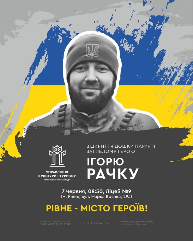– Із перших днів повномасштабного вторгнення він став на захист Батьківщини. Воював за свою сім’ю, за своїх двох донечок, за країну… Старший солдат Ігор Рачок загинув 1 серпня 2023 року на Харківському напрямку, – йдеться у повідомленні міської ради Рівного.