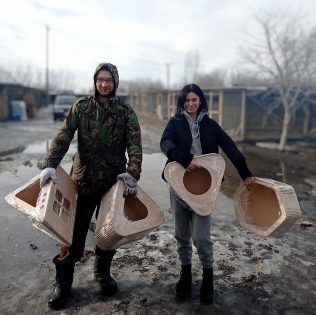 Волонтери купили будиночки для котів і збудували буди для собак. Хлопців, які будували буди, пригостили обідом.