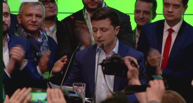 «Ми зробили це разом, – розпочав Володимир Зеленський. – Зараз не буде ніякого пафосу. Просто хочу сказати дякую своїм батькам за підтримку і за те, що вони це пережили. Моїй дружині – за силу і витримку. Якби вона раніше почула про мене все, що говорили, мабуть, вона не вийшла б за мене. Дякую усій моїй родині, усій моїй команді, усьому штабу. Дякую правоохоронцям та СБУ, що тримали мене у тонусі. Дякую усім нашим військовим та волонтерам, які захищають нашу країну. Дякую всім українцям. Я обіцяю, що ніколи не підведу вас всіх. Поки я ще офіційно не президент, можу сказати як громадянин України усім країнам пострадянського простору: подивіться на нас – усе можливо».