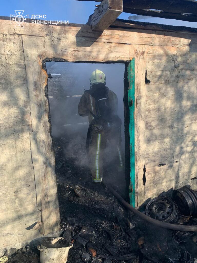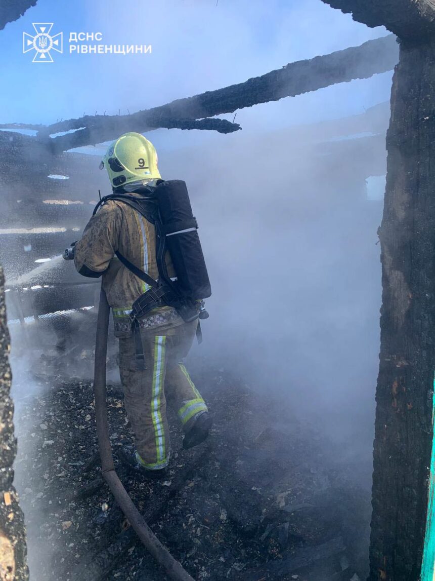 – По прибуттю вогнеборці побачили, що вогнем охоплено перекриття господарчої споруди. На ліквідацію пожежі відразу було подано вогнегасні речовини. Вогнем знищено покрівлю та перекриття господарської споруди на площі 40 кв. м та пошкоджено стіни будівлі. До ліквідації пожежі було залучено дві автоцистерни та 9 рятувальників. Причина пожежі та розмір завданих збитків встановлюються, – повідомили у ГУ ДСНС Рівненщини.
