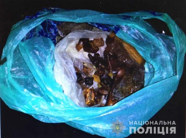 Під час огляду транспортного засобу, зокрема й багажного відділення, у рюкзаку поліцейські виявили каміння, схоже на бурштин-сирець. Слідчо-оперативна група на місці зафіксувала, що у наплічнику знаходилось близько двох кілограмів каменів.