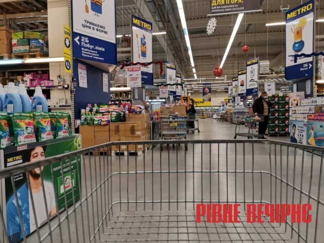 У супермаркеті «Метро», що на вулиці Макарова, у суботу відвідувачів було не дуже багато. Багато відділів закрито, а товари на полицях в тих відділах недоступні для відвідувачів.