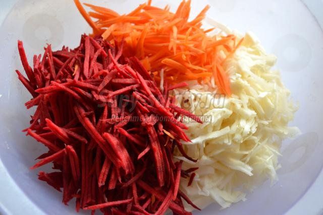 1 κг білоголової капусти, 2 середніх буряки, 2 морквини, 2 цибулини