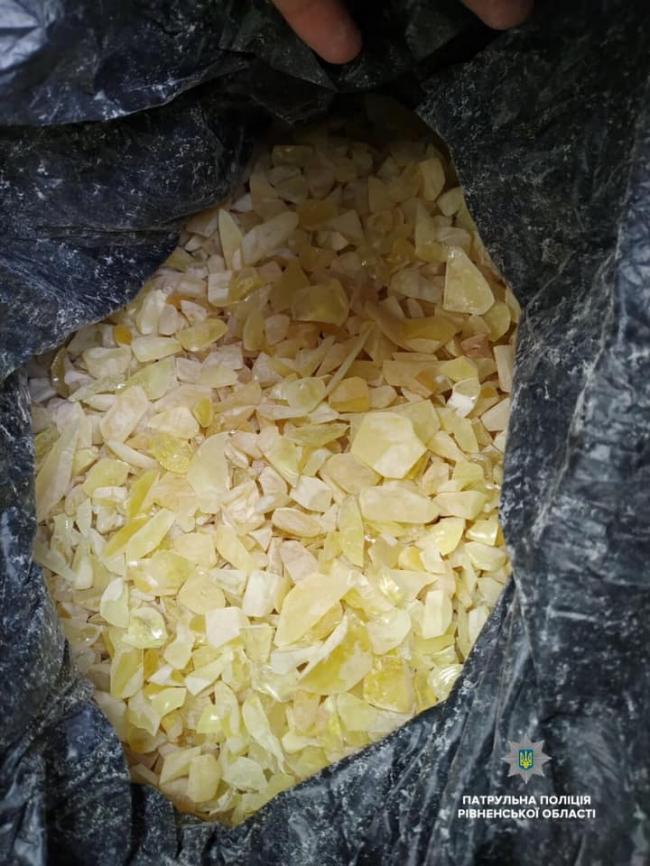 Поліцейські виявили в багажнику авто пакет чорного кольору, в якому знаходилось каміння, ззовні схоже на сирець бурштину, вагою близько 3 кг. На місце події викликали слідчо-оперативну групу.
