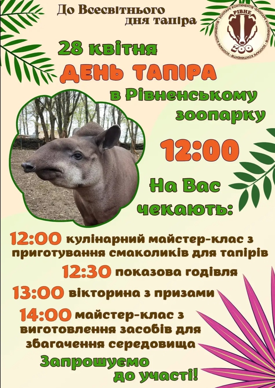 28 квітня у зоопарку відзначатимуть День тапіра. Обіцяють майстер-класи, показову годівлю та вікторину з призами.