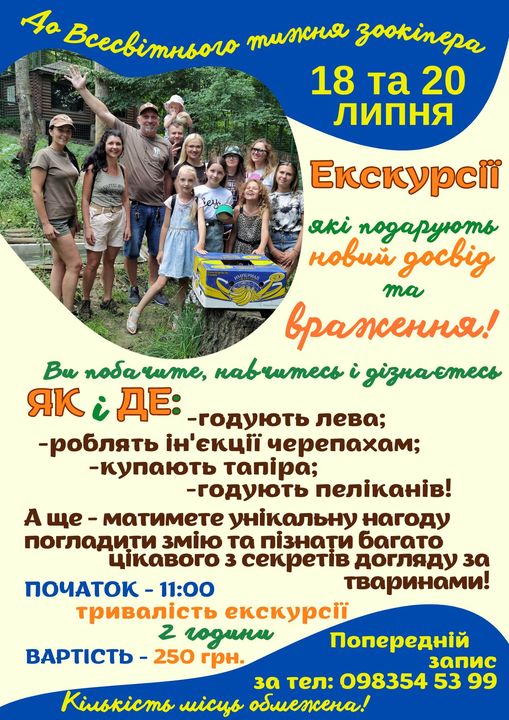 – До Всесвітнього тижня зоокіпера: 18 та 20 липня запрошуємо усіх бажаючих випробувати свої сили в якості професійних доглядачів за тваринами – зоокіперів!Наші екскурсії відкриють Вам багатогранний світ життя звірів, навчать дбати про них, відкриють секрети та хитрощі, як знайти підхід до найвпертіших підопічних, допоможуть отримати новий, цікавий досвід з догляду та піклування за тваринами! А також – отримати заряд позитиву й енергії від спілкування з мешканцями зоопарку! – йдеться на сторінці Рівненського зоопарку.