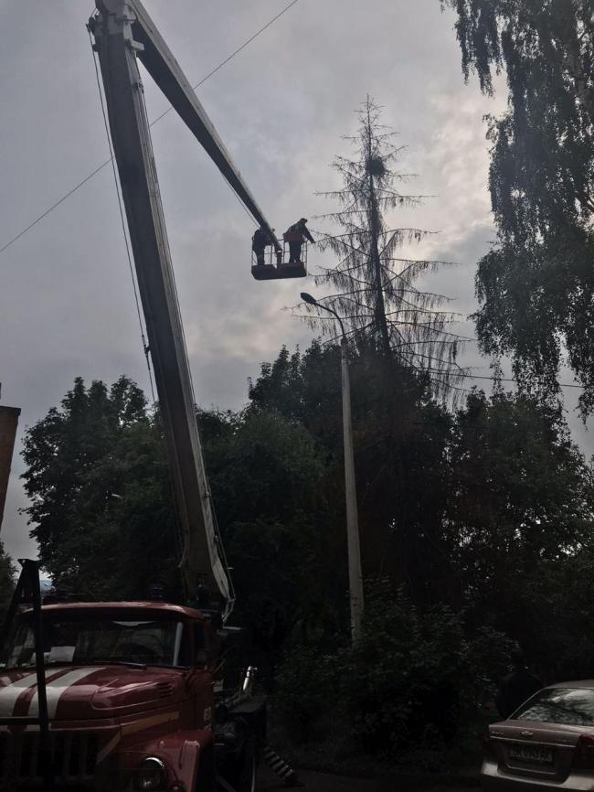 Дерево росло на вулиці Відінській у Рівному. Рятувальники на підіймачі піднялися спершу до верхівки та зрізали бензопилою аварійне гілля, а потім – увесь стовбур.