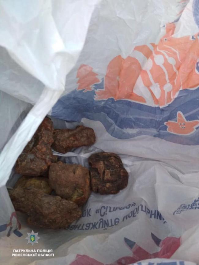 Під час поверхневої перевірки поліцейські виявили на передньому пасажирському сидінні поліетиленовий пакет, в якому знаходилось каміння, ззовні схоже на сирець бурштину, вагою майже 1 кілограм.