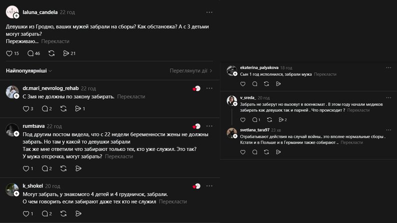 “Дівчата з Гродна, ваших чоловіків забрали на збори? Як ситуація? З трьома дітьми можуть забрати?” Їй у коментарях відповіли, що бачили, що забирають і з чотирма, і навіть тих, хто раніше не служив.