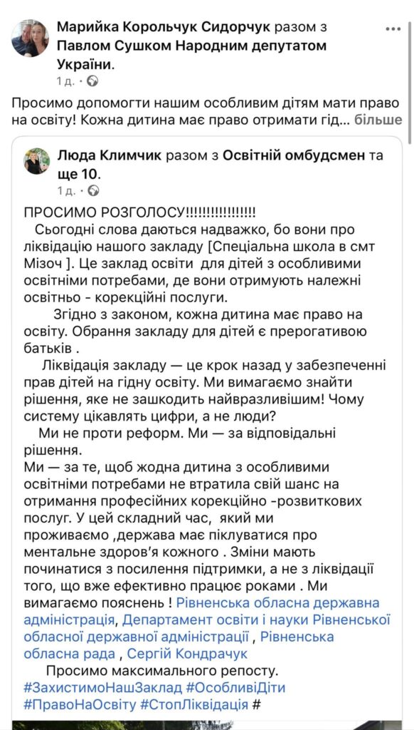 На сайті Рівненської обласної ради опубліковані чотири проєкти рішень про проведення громадських слухань про ліквідацію спецшкіл у Мізочі, Великих Межиричах, Тучині та в селі Чудель. Ініціаторами цих рішень є департамент освіти і науки Рівненської ОВА, а не Рівненська облрада. Закриття спеціалізованих шкіл відбувається, щоб зекономити кошти.