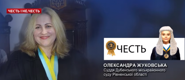 За турботливе ставлення до справ дитини суддя Олександра Жуковська отримала від нас нагороду “Честь тижня”, а за результатами голосування телеглядачів потрапила у трійку найбільш достойних суддів країни.