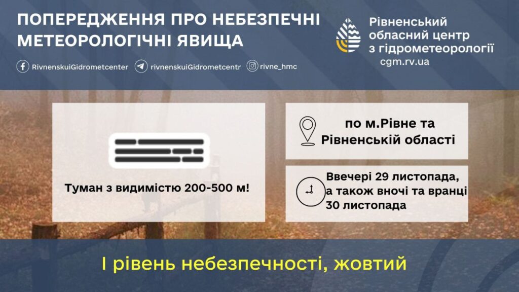 Сьогодні ввечері 29 листопада, а також вночі та вранці 30 листопада по місту Рівне та області очікується туман з видимістю 200-500м. 1-й рівень небезпечності, жовтий, – кажуть в обласному центрі з гідрометеорології.