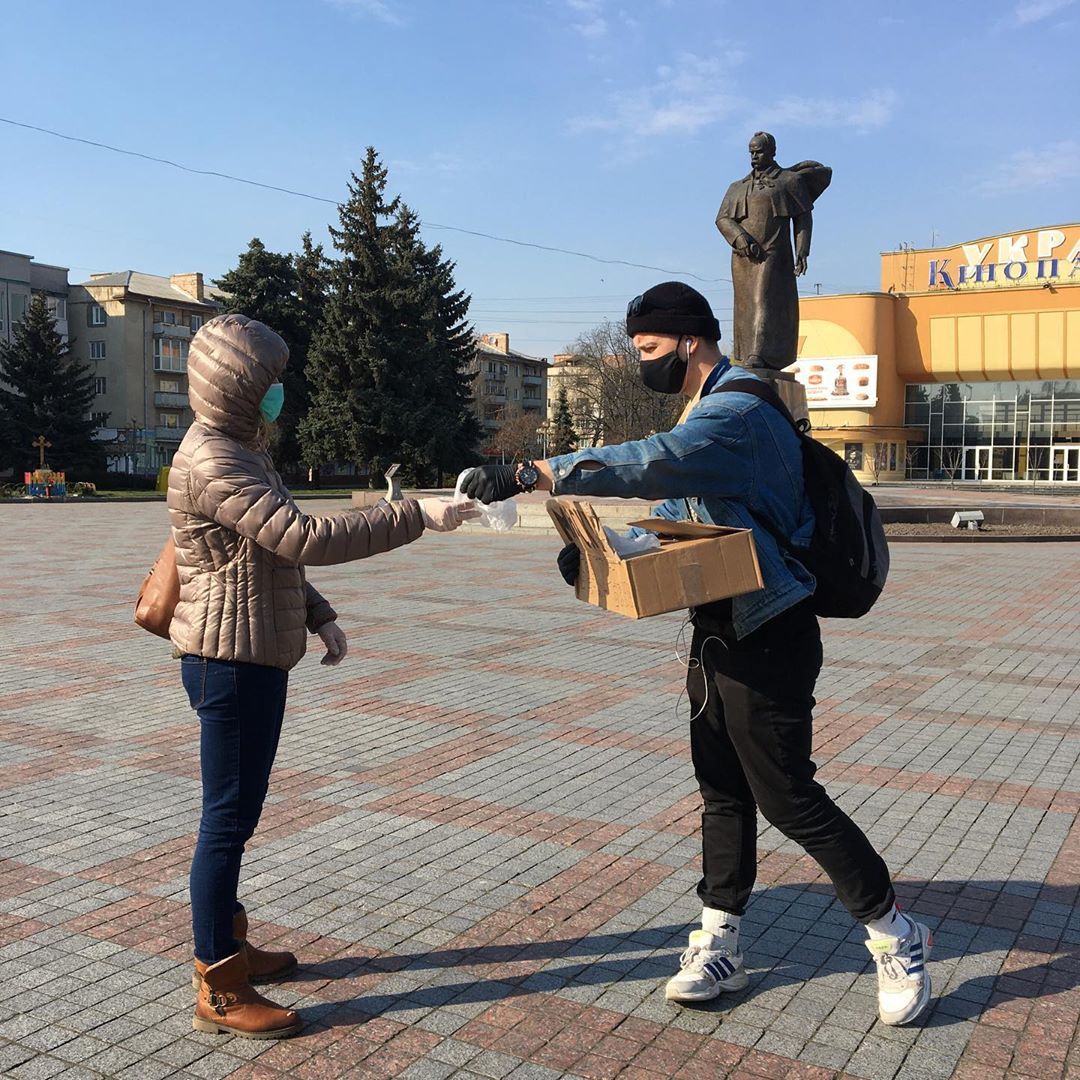 На майдані Незалежності у Рівному провели «захисну акцію». Парубок роздавав перехожим захисні маски.
