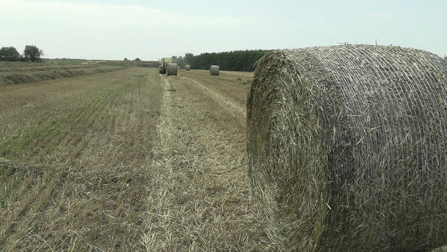 Подібний процес тюкування відбувається і неподалік села Зоря. Тут покоси пшеничної соломи після проїзду трактора теж перетворюються в масивні круглі тюки.