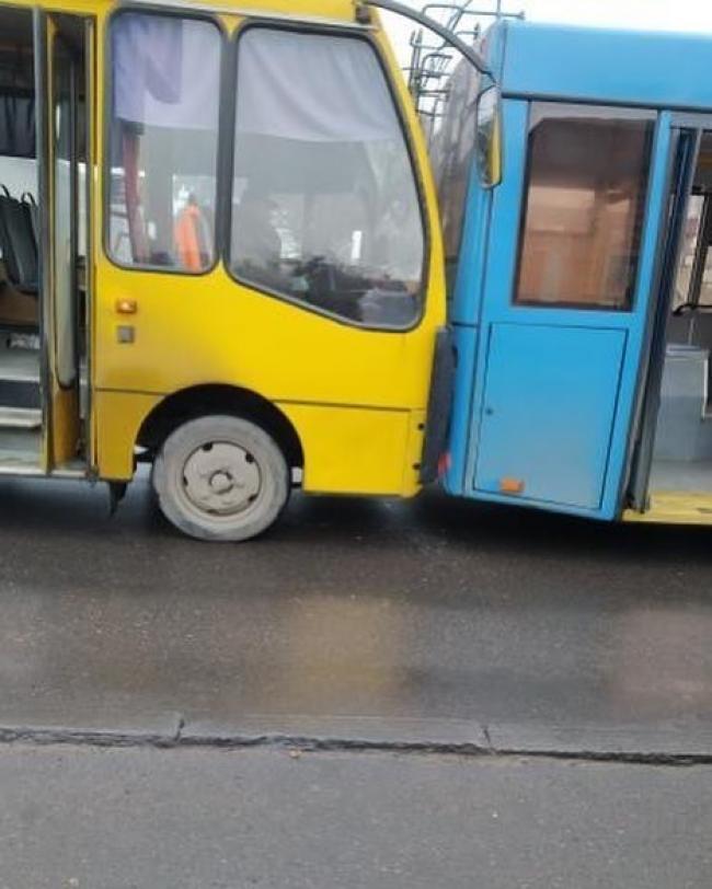 Очевидці повідомляють про нову дорожньо-транспортну пригоду в Рівному за участю жовтого маршрутного таксі та синього тролейбуса.