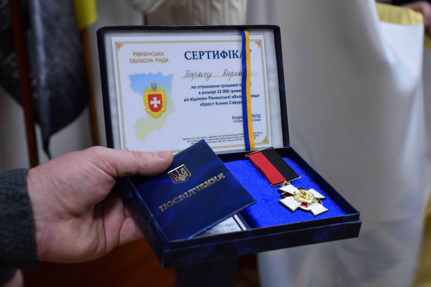 Рішення про нагородження Тараса Деркача Рівненська обласна рада ухвалила ще 19 грудня минулого року. Однак через службу на фронті вручити відзнаку тоді не змогли, тож нагороду передали військовому лише зараз. Разом із відзнакою захисник отримав грошову премію у розмірі 25 тисяч гривень.
