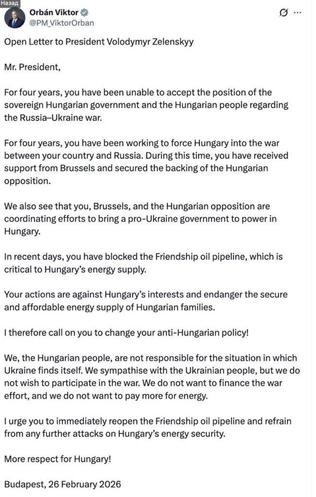 Віктор Орбан на своїй сторінці в соцмережі Х сьогодні написав “відкритого листа” президенту України Володимиру Зеленському. Невідомо, на яку реакцію від української влади він розраховує, але у своєму зверненні скандальний політик вимагає відкрити нафтопровід “Дружба”, бо “симпатизує українському народу, але не хоче брати участі у війні, не хоче її фінансувати і не хоче платити більше за енергоресурси”.