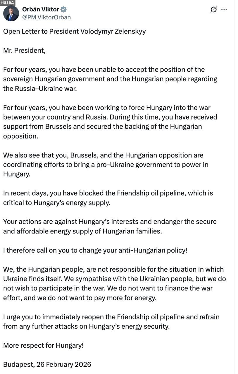 Віктор Орбан на своїй сторінці в соцмережі Х сьогодні написав “відкритого листа” президенту України Володимиру Зеленському. Невідомо, на яку реакцію від української влади він розраховує, але у своєму зверненні скандальний політик вимагає відкрити нафтопровід “Дружба”, бо “симпатизує українському народу, але не хоче брати участі у війні, не хоче її фінансувати і не хоче платити більше за енергоресурси”.