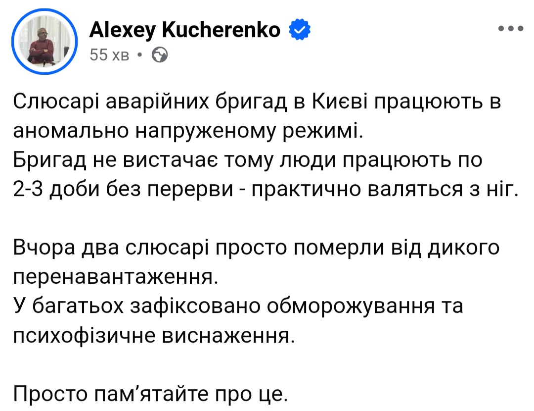 За інформацією народного депутата Олексія Кучеренка, фахівці аварійних бригад працюють без перерви по 2-3 доби поспіль. Через важку працю у низки працівників спостерігаються обмороження та психофізичне виснаження. Двоє слюсарів померли, не витримавши надмірного навантаження на роботі…