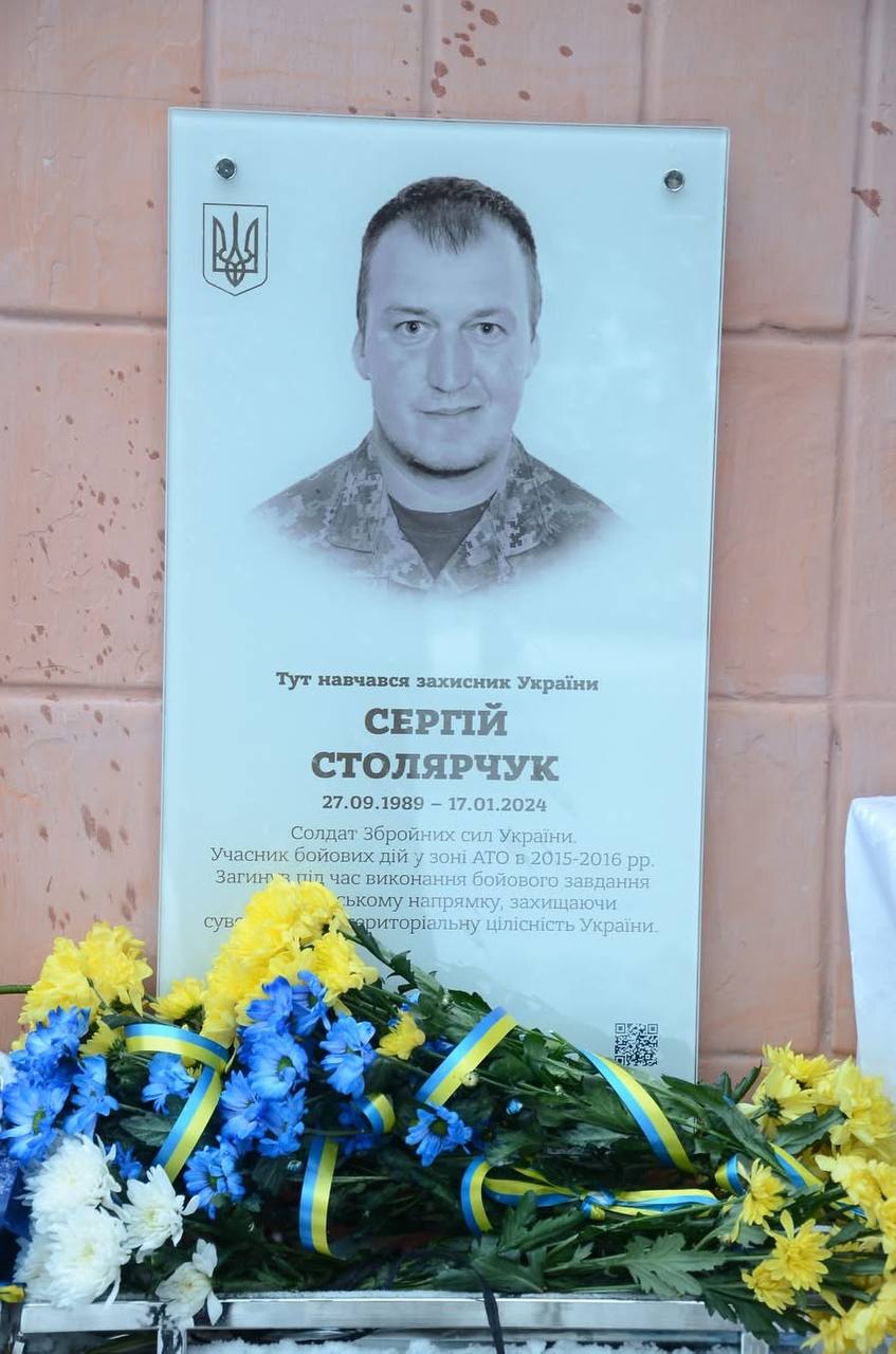 Сьогодні на фасаді Рівненського ліцею №9 відкрили меморіальну дошку на честь загиблого Героя – Сергія Столярчука, повідомили у міській раді Рівного.