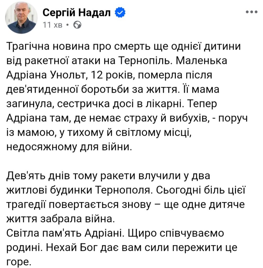 Як повідомив міський голова Тернополя Сергій Надал, у лікарні померла 12-річна Адріана Унольт – після дев’ятиденної боротьби за життя. Її матір загинула, а сестричка досі в лікарні.