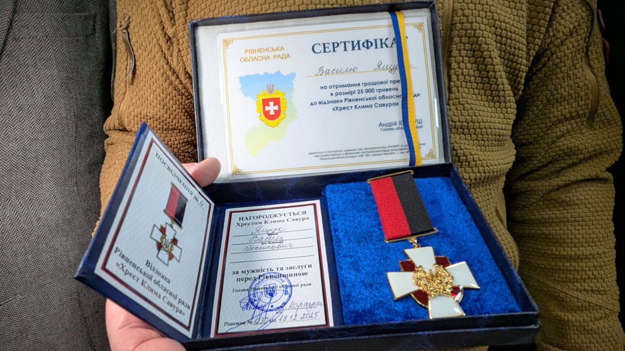 – З приємністю вручив Василю Ящуку “Хрест Клима Савура”. Василь Ящук – старший бойовий медик з Рівненщини служить у 42-й окремій механізованій бригаді імені Героя України Валерія Гудзя. 50-річний сержант на фронті з 2023 року, керівництво характеризує його як відповідального і такого, хто здатен приймати правильні рішення в складних умовах. Із побратимами він перебуває на Покровському напрямку, раніше виконував завдання у Донецькій, Харківській та Дніпропетровській областях, – розповів голова обласної ради Андрій Карауш.