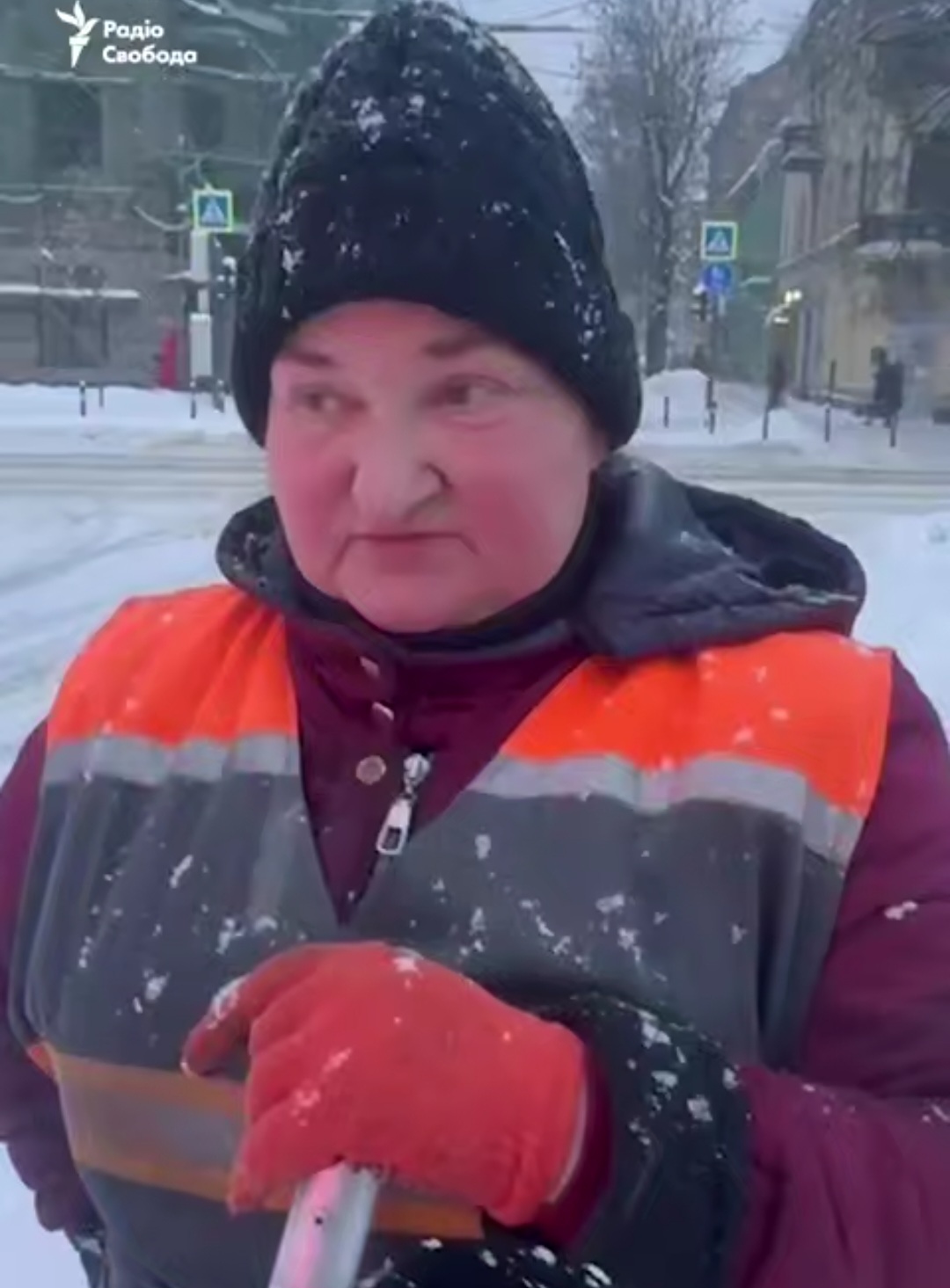Та найбільше на відео вражає реакція двірника: уламки палають їй буквально під ноги, та вже за мить жінка спокійно продовжує прибирати сніг.