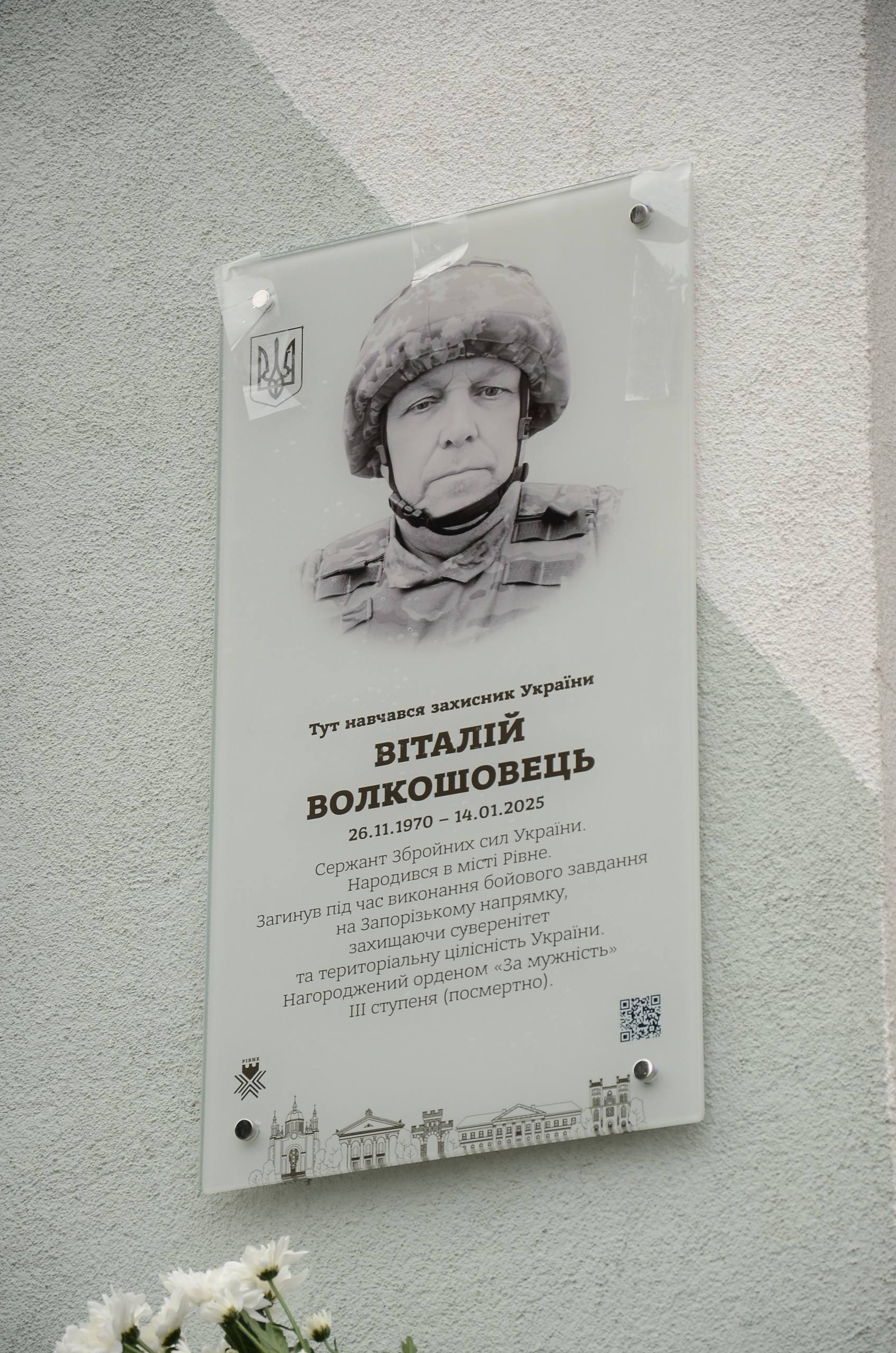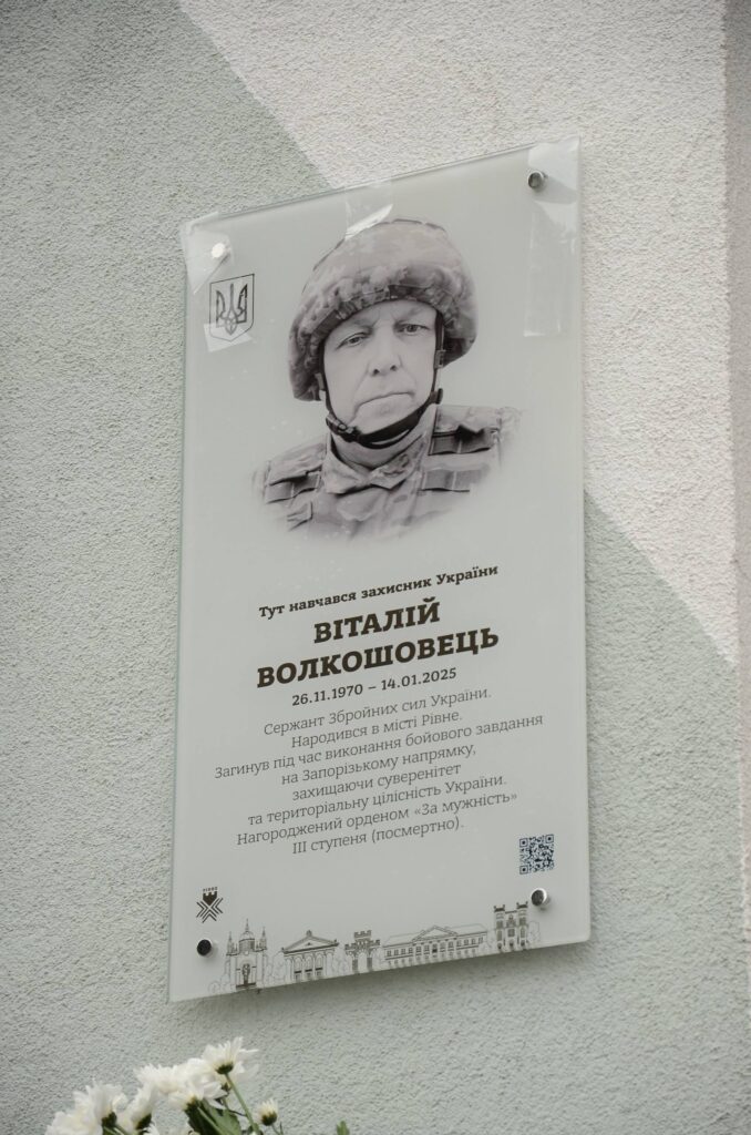Сьогодні на фасаді Рівненського ліцею №18 відкрили меморіальну дошку на честь загиблого Героя – Віталія Волкошовця, повідомили у міській раді.