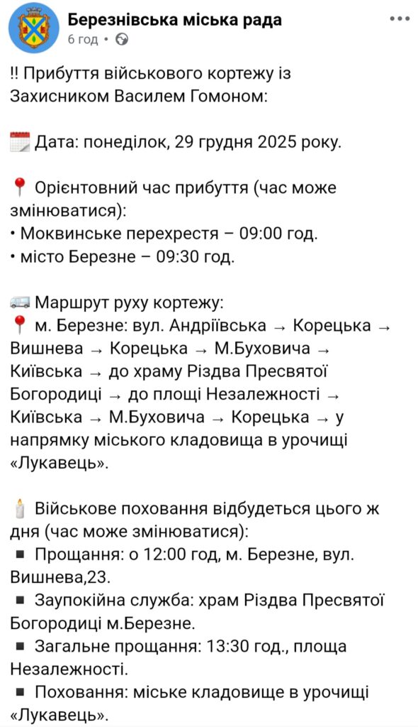 У Березнівській громаді просять гідно зустріти хороброго земляка і провести його в останню земну дорогу. Прибуття скорботного кортежу очікують завтра, 29 грудня.