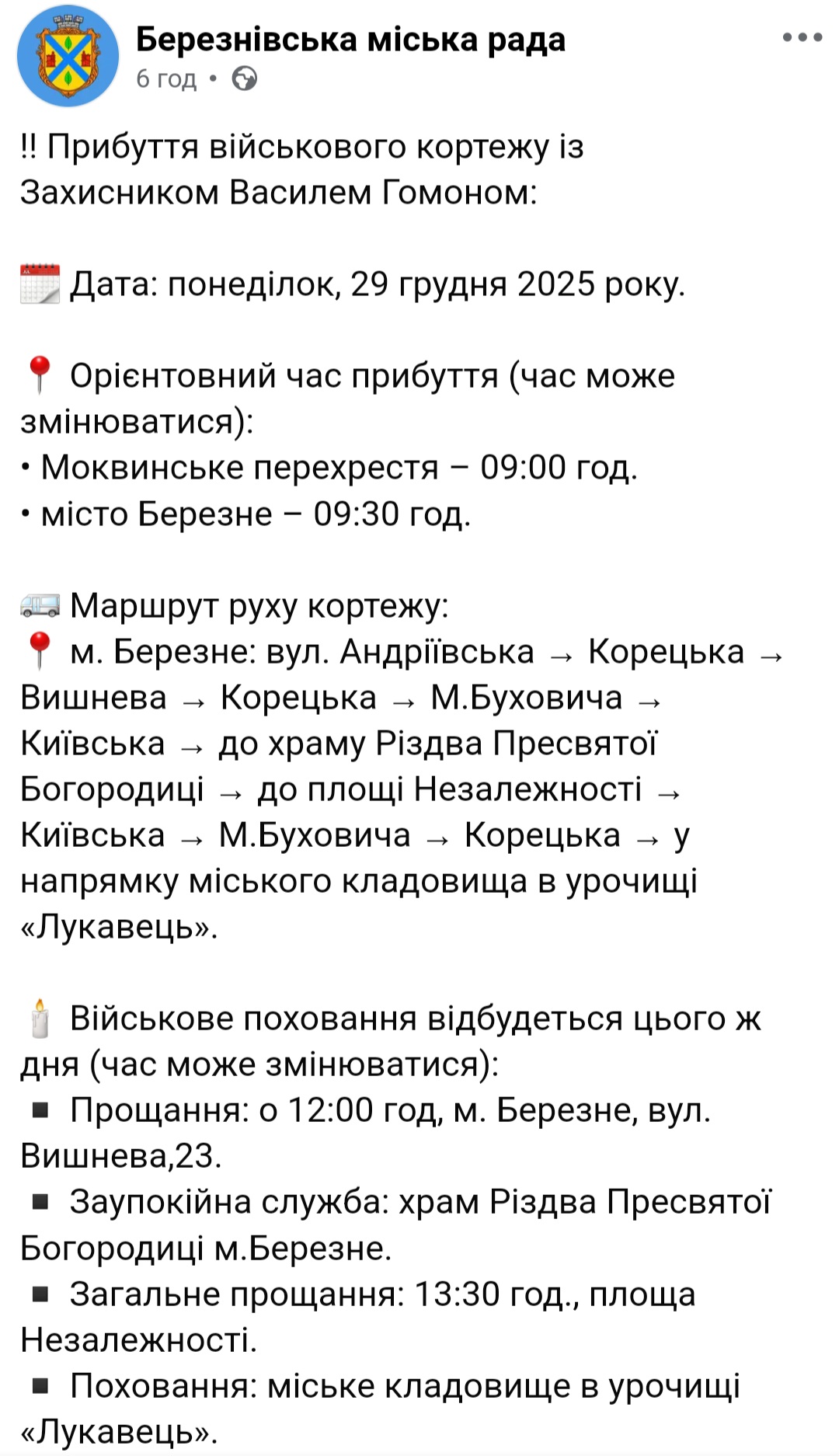 У Березнівській громаді просять гідно зустріти хороброго земляка і провести його в останню земну дорогу. Прибуття скорботного кортежу очікують завтра, 29 грудня.