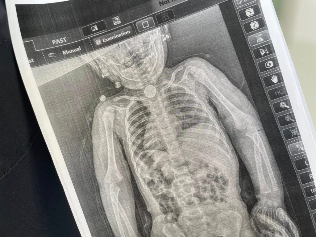 Лише після появи блювання, кашлю та свистячого дихання батьки наполягли на додатковому обстеженні. Рентген показав стороннє тіло у стравоході.