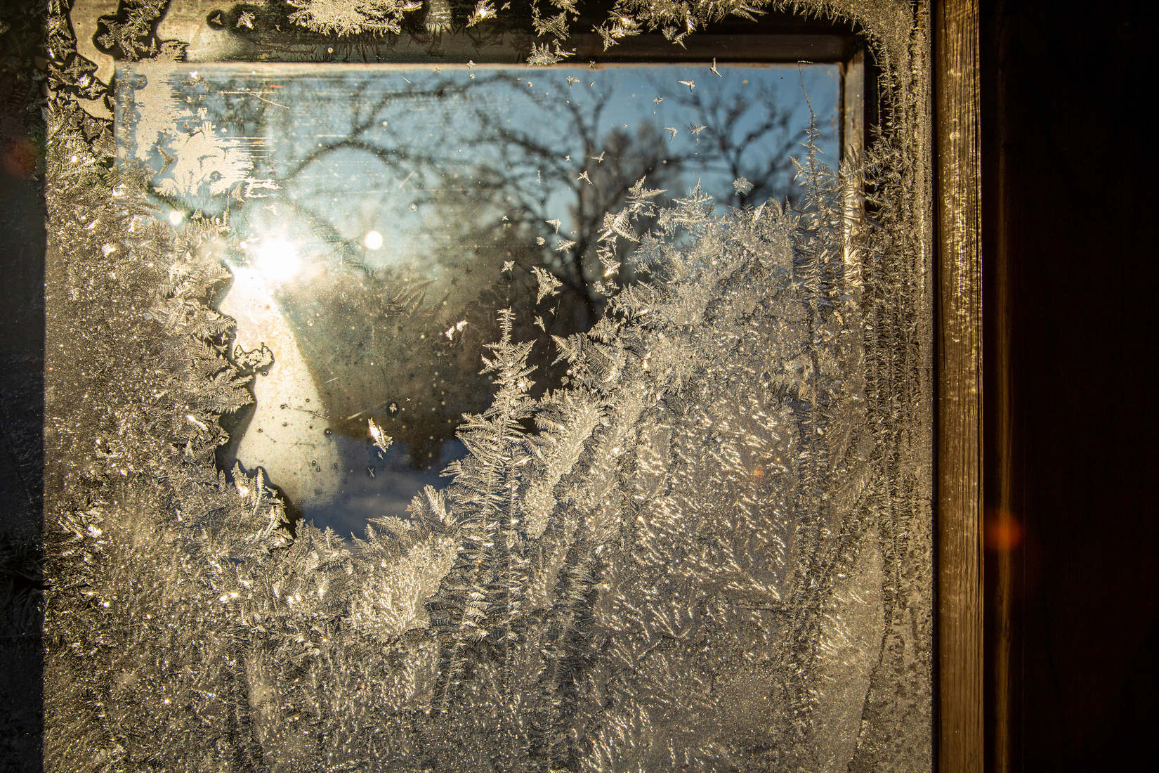 Старі дерев’яні вікна мали щілини, через які заходило холодне повітря і волога. Коли тепле вологе повітря з кімнати зустрічалося з холодним склом — утворювався конденсат, який замерзав у вигляді візерунків.
