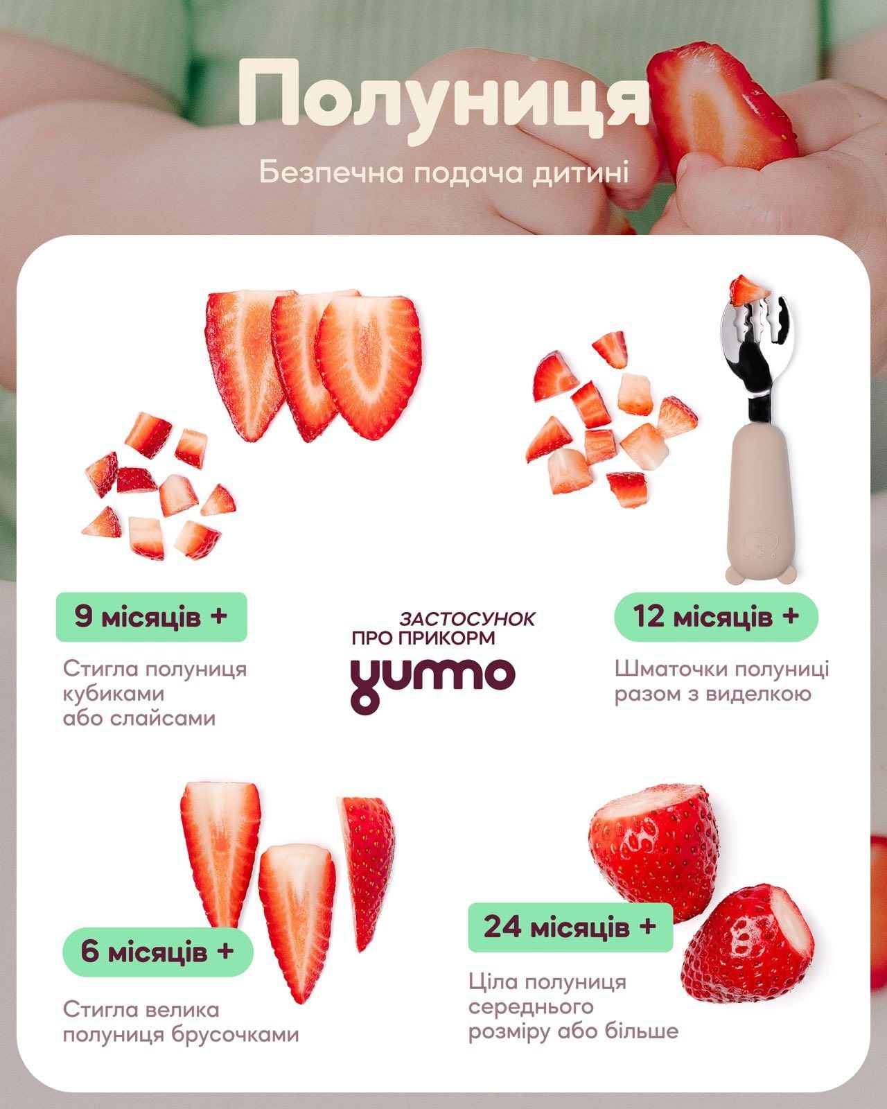 Сучасні рекомендації, каже Ольга Дорош, дозволяють вводити полуницю з початком прикорму (близько 6 місяців) за умови готовності дитини до прикорму і в правильній подачі. Як і будь-який новий продукт, полуницю варто вводити поступово, починаючи з невеликої кількості та спостерігати за реакцією дитини.