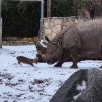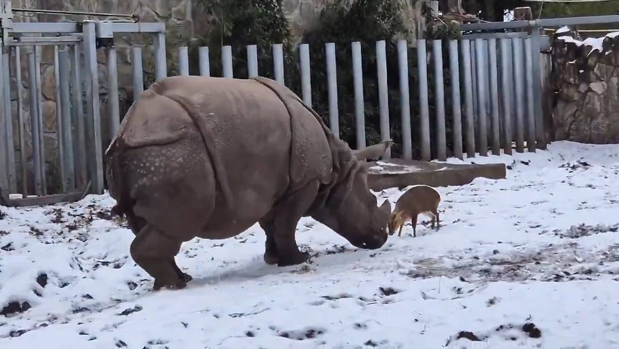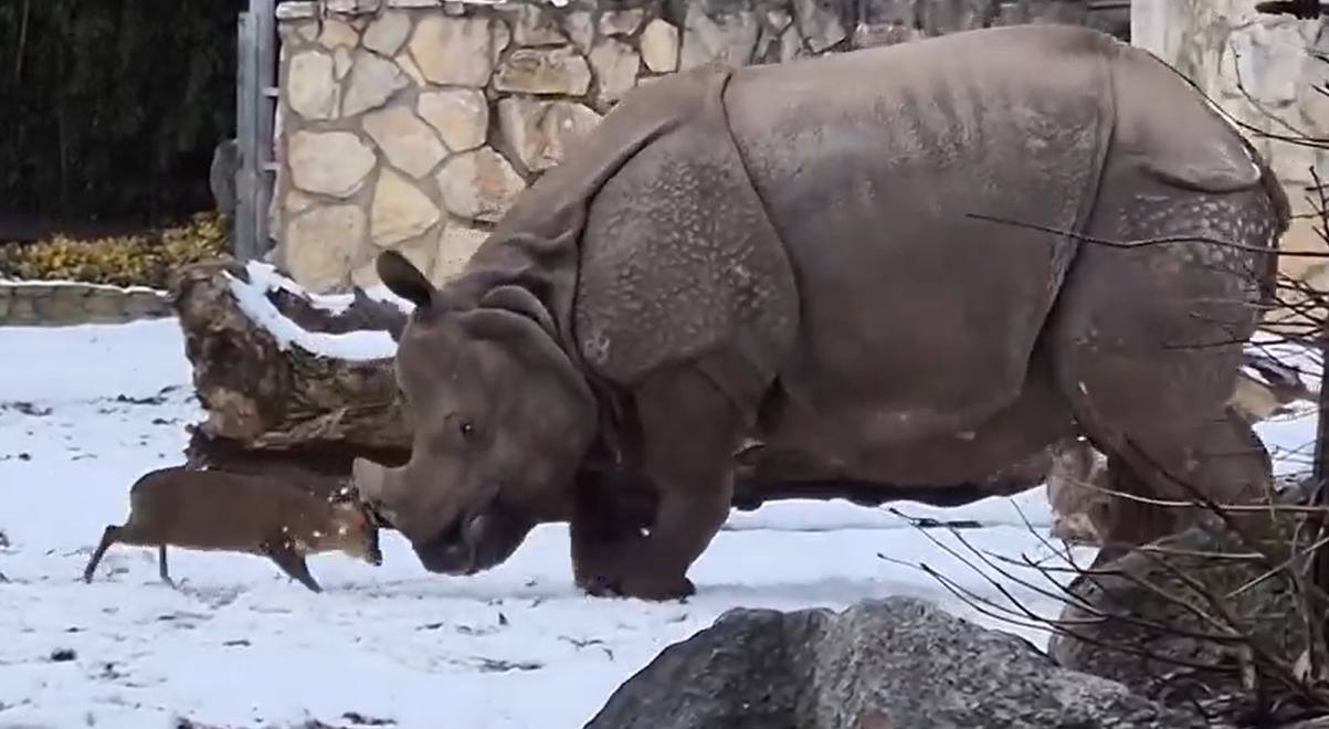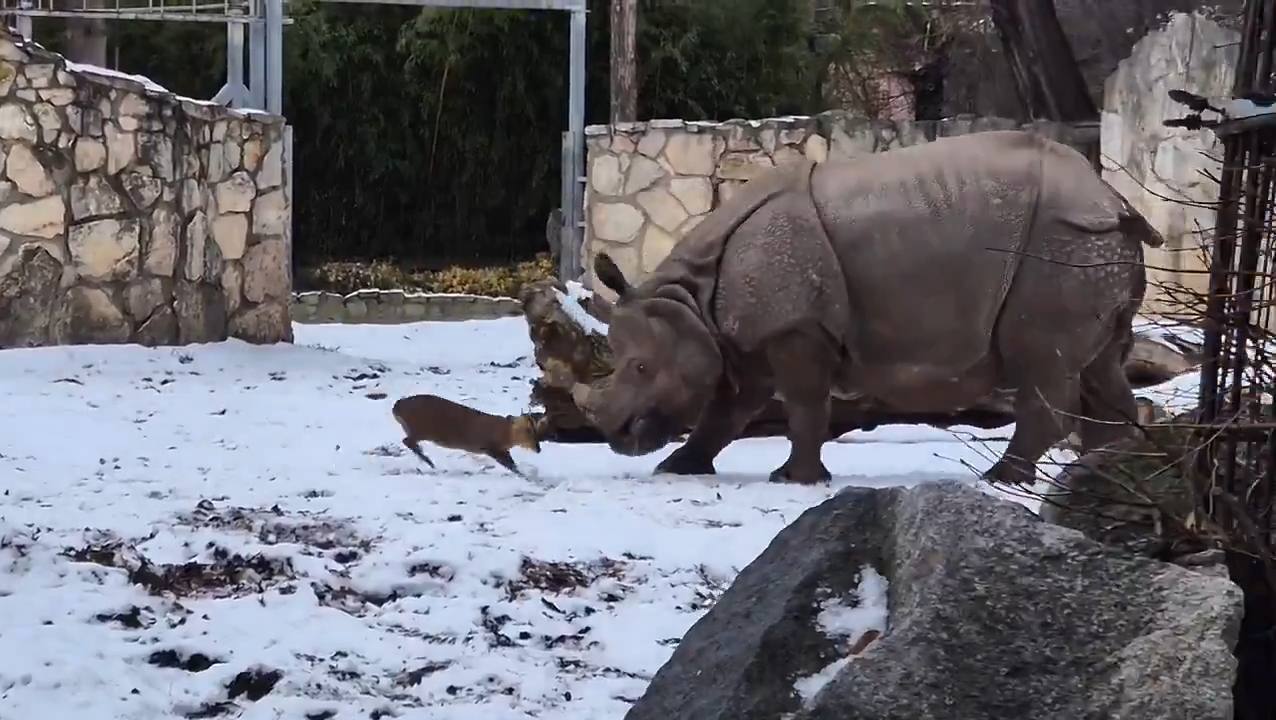 Бажаючи покрасуватися перед самками, карликовий азіатський олень мунтжак, вагою всього 10-18 кг, напав на африканського носорога на прізвисько Марушка, який важить майже в 100 разів більше, і спробував його забодати.