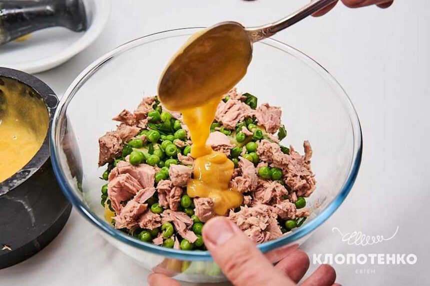 Відкрийте банку тунця у власному соку та злийте рідину. У миску до картоплі з горошком додайте тунець, трохи солі та перемішайте.