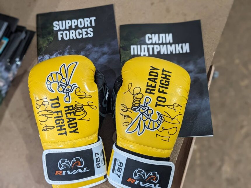 Боксерські рукавички з автографом Олександра Усика для розіграшу передали волонтери з Києва, які мали можливість особисто отримати підпис спортсмена.